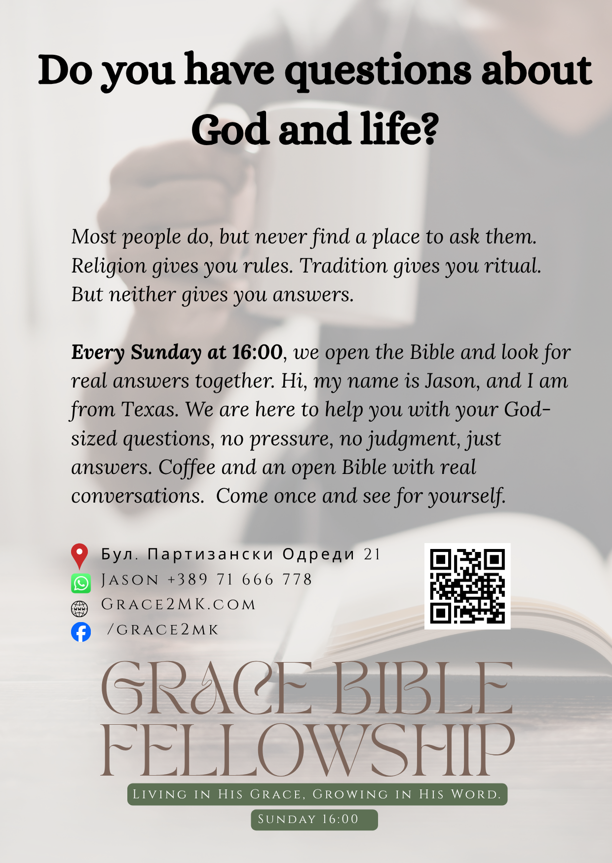 We are excited to announce the start of our regular fellowship times here in Skopje! Beginning Spring 2026, we will meet weekly for: